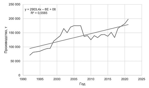 Рис. 1.1. Динамика производства малины в России, по данным ФАО