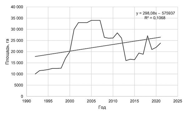 Рис. 1.2. Динамика площади, на которой выращивается малина в России, по данным ФАО