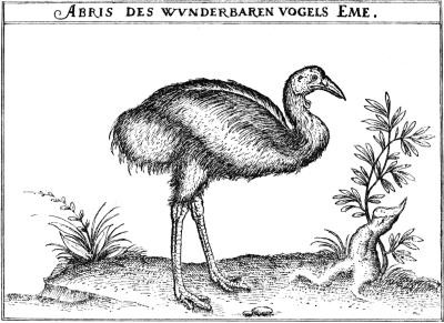 Abris des wvnderbaren Vogels Eme. From the fifth edition of Erste Schiffart in die orientalische Indien so die holländische Schiff im Martio 1595 aussgefahren vnd im Augusto 1597 wiederkommen verzicht … Durch Levinvm Hvlsivm. Editio Quinta. Getruckt zu Franckfurt am Mäyn durch Hartmann Palthenium in Verlegung der Hulfischen. Anno M.DC.xxv., From a copy of the book in the British Museum. By permission of the Keeper of Printed Books.