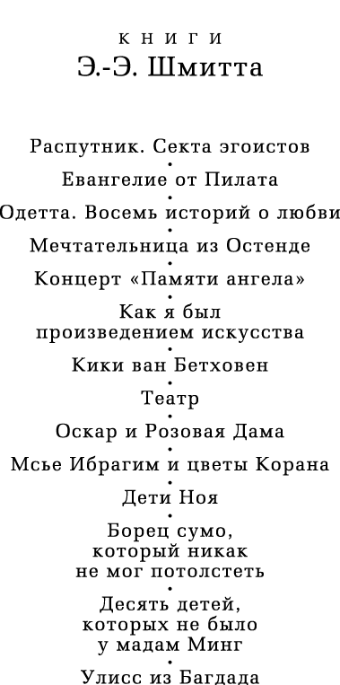 Эрик-Эмманюэль Шмитт — мировая знаменитость, это едва ли не самый читаемый и играемый на сцене французский автор. В удивительном сюжете вплетаются три истории из трех различных эпох.