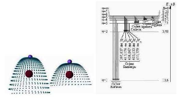 Это поле графически состоит из асимметрически совмещённых поля электрона и центрального поля протона, излучающих противоположные по знаку зёрна-электропотенциалами (два встречных поля). Силовые линии поля исходят (условно) из поверхности положительного заряда и входят в поверхность отрицательного — каков механизм их образования? Это процесс линейной аннигиляции противоположных по знаку зёрен-электропотенциалов, который рождает силовые линии, обозначающей границы зоны холодной безмассовой плазмы. Этот процесс уничтожает линейное пространство-поле и тем самым создаёт нити силового притяжения (силу) противоположных по знаку зарядов — это закон Кулона. В момент квантового перехода электрона в атоме из возбуждённого состояния в основное уменьшается расстояние до ядра, путём притяжения и движения к нему электрона за счёт соответствующего уменьшения размера волновода (фото 1). В начале движения электрона в основное состояние этот процесс начинает уменьшать заряд энергии электрона (что проявляется в укорочении длины его волновода (фото 1) на определённую долю энергии (заряд энергии фотона), которая и выделяется в виде части от первичного магнитного монополя электрона за определённое время. Возбуждённый атом — это замкнутая система — должен выполняться закон сохранения энергии. С одной стороны, происходит процесс изменения электрического поля в атомном пространстве-поле между сближающимися зарядами, а с другой стороны, движущийся электрон согласно закону Луи де Бройля должен излучать волны.