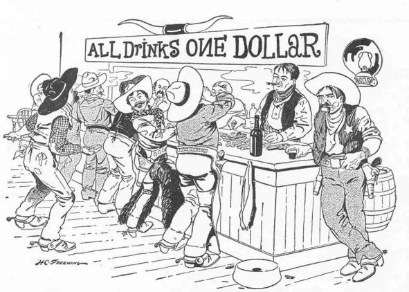 Сначала мы отправились в главный салун города, который назывался «Голубая Змея», и выкупили его за 1, 200 долларов. Затем, якобы, спасаясь от дождя, мы нагрянули в забегаловку мексиканца Джо. Потолковали с ним о том о сем, и купили её за 500 долларов. Ну а третья берлога нам досталось за 400 долларов. Таким образом, мы стали монополистами и владельцами питейного бизнеса в этом городе.
