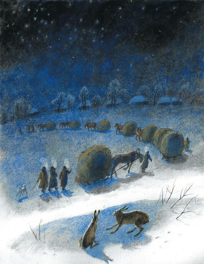 Заяц опять остановился подле дороги. Мужики шли подле саней с поднятыми воротниками кафтанов. Лица их были чуть видны. Бороды, усы, ресницы их были белые. Изо ртов и носов их шёл пар. Лошади их были потные, и к поту пристал иней. Лошади толкались в хомутах, ныряли, выныривали в ухабах. Мужики догоняли, обгоняли, били кнутами лошадей. Два старика шли рядом, и один рассказывал другому, как у него украли лошадь.