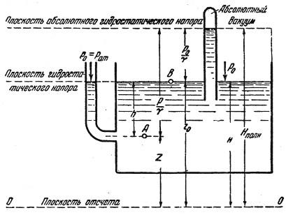Полученное уравнение означает: полное или абсолютное давление в любой точке покоящейся жидкости складывается из давления на ее свободной поверхности ро и давления рgh, созданного весом выше лежащего слоя жидкости (так называемого столба жидкости).