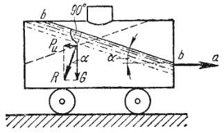 Свободная поверхность, как поверхность равного давления, должна быть нормальна к указанной равнодействующей, поэтому она в данном случае представит собой уже не горизонтальную плоскость, а наклонную, составляющую угол