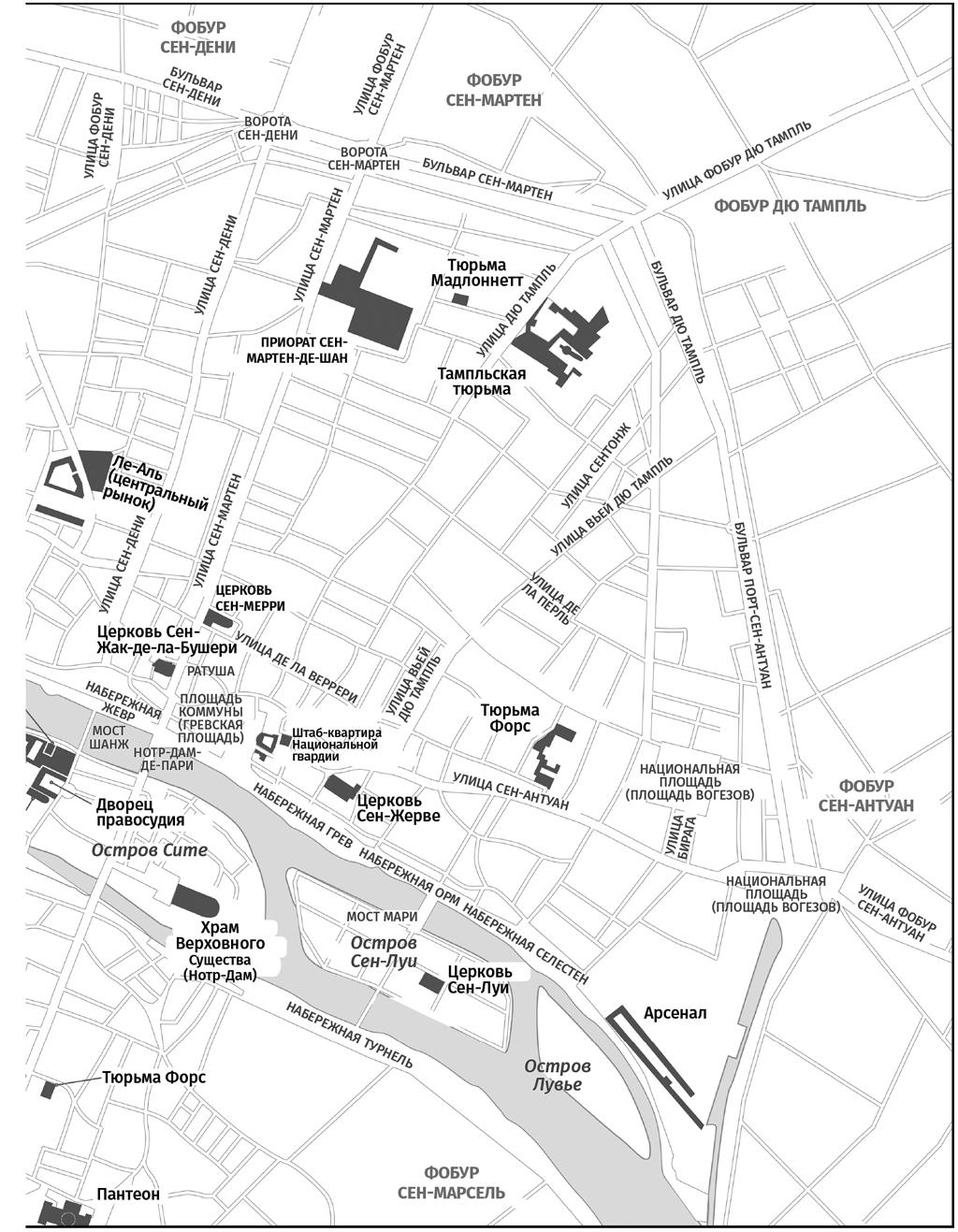 Многие главные улицы и общественные здания были официально переименованы в ходе реализации политики революционного террора. В именах святых часто опускался их церковный статус: например, улицу Сент-Оноре иногда называли улицей Оноре, предместье Сент-Антуан — предместьем Антуан. Однако многие из этих официальных переименований не получили широкого распространения среди парижан и не укоренились в языке. Следовательно, я использовал новые революционные названия только там, где они получили широкое распространение: таким образом, старую (и современную) площадь Отель-де-Виль обычно именовали площадью Коммуны, тогда как площадь Каррузель за пределами дворца Тюильри редко называли ее новым официальным названием — площадь Соединения. Я всегда старался выбирать наиболее уместное и наименее вводящее в заблуждение название.