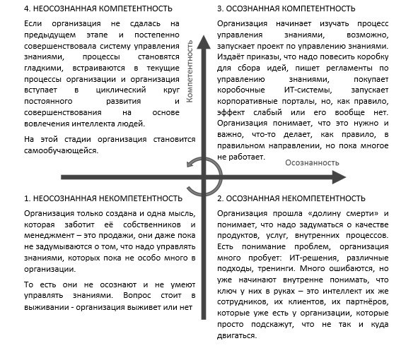 Здесь может возникнуть закономерный вопрос: «Разве организации не управляют своими знаниями, знаниями своих сотрудников?». Безусловно все организации в том или ином виде управляют знаниями и в той или иной степени являются самообучающимися организациями. Однако есть такое понятие как «зрелость процесса», «зрелость системы».