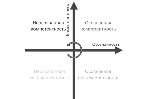 Изучая что либо, во всех своих делах, человек последовательно движется из нижнего левого угла (неосознанной некомпетенции) в верхний левый (неосознанной компетенции) против часовой стрелки. Его знания проявляются.