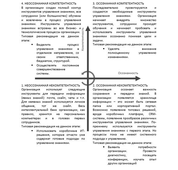 Таблица 1 – Четыре стадии обучения с точки зрения стадий зрелости «процесса» управления знаниями
