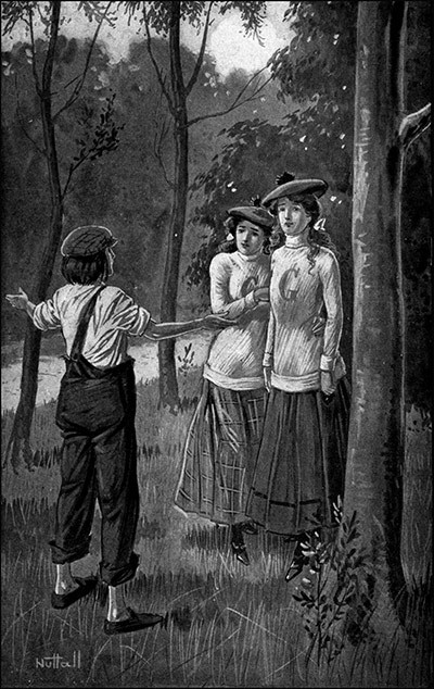 At this Miette and Dorothy hurried toward the road, but just as they were about to reach the open path a boy deliberately jumped out from the bushes, and stretched out his arms to bar their way!