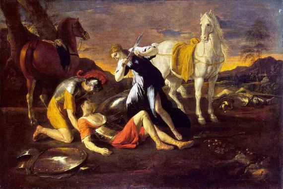Многие знаменитые картины французского живописца Никола Пуссена написаны по мотивам поэмы Торквато Тассо «Освобожденный Иерусалим». Но не сама история славных походов рыцарей-крестоносцев в Палестину занимала художника – его полотна прославляют любовь… Что ж – свидетельств великой рыцарской любви история сохранила немало. Одна гласит, как во время похода Танкред взял в плен прекрасную Эрминию, царскую дочь и волшебницу. Девушка полюбила великодушного рыцаря. Узнав о том, что во время боя он ранен мавром, она поспешила к нему. Танкред победил – но истекал кровью… И тогда Эрминия, отрезав кинжалом свои роскошные волосы, обладающие волшебной силой, перевязала его раны… Этот момент и запечатлел живописец. Золотистые отблески лежат на железных доспехах рыцаря и его белоснежной рубашке; предзакатным солнцем освещена фигура белого коня. Великолепная картина была в 1766 году приобретена в Париже для Екатерины II…