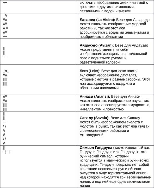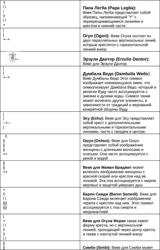 Веве — это символические рисунки, которые ассоциируются с различными лоа (духами или богами) в религии Вуду. Каждый Лоа имеет свой собственный уникальный веве, который используется для призыва и обращения к нему во время ритуалов и церемоний. Ниже приведены примеры веве для некоторых из наиболее известных Лоа (богов) в Вуду и их краткое описание: