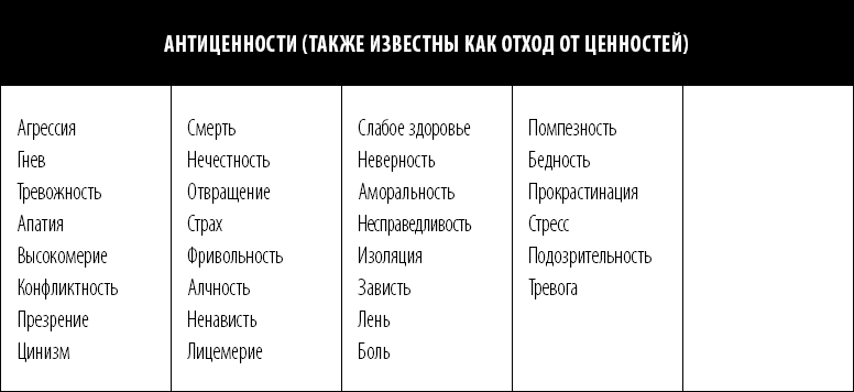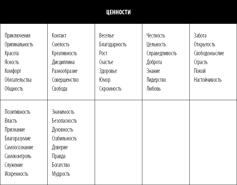 Следующие две главы содержат список ценностей, а заодно и так называемых антиценностей. Пока же просто загляните в него одним глазком, чтобы понять, от чего отталкиваться.