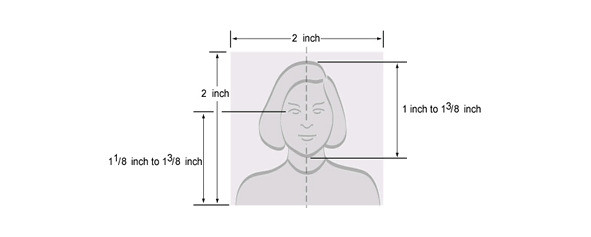 На фотографии должна быть видна вся голова, начиная с верхней части, включая волосы, до нижнего края подбородка. Высота головы должна составлять 25—35 мм (1-1-3/8 дюймов) или занимать 50%-70% фотографии: