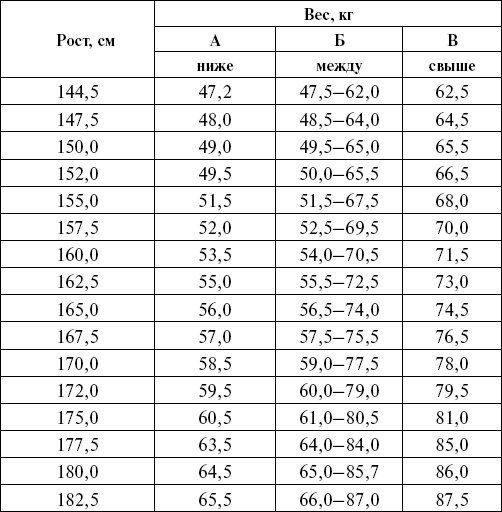 В первой колонке цифры обозначают рост в сантиметрах. В колонках А, Б и В – вес в килограммах. Найдите соответствующую вашему росту цифру в первой колонке и отыщите напротив нее ваш вес до беременности в колонках А, Б или В.