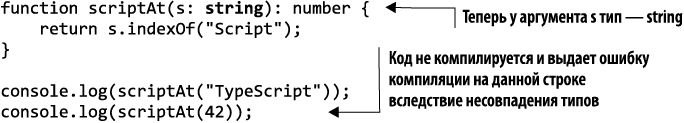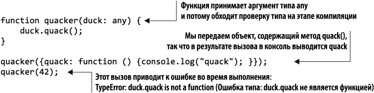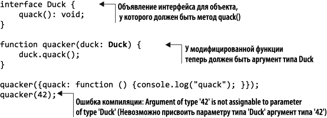 При статической типизации, с другой стороны, проверка типов производится на этапе компиляции, так что попытка передать аргумент не того типа вызывает ошибку компиляции. Для полноценного использования возможностей статической типизации TypeScript можно усовершенствовать код, объявив в нем интерфейс Duck и указав соответствующий тип аргумента функции, как показано в листинге 1.14. Обратите внимание: в TypeScript не обязательно явным образом указывать, что мы реализуем интерфейс Duck, лишь бы был метод quack(). Если функция quack() есть, то компилятор считает интерфейс реализованным. В других языках программирования пришлось бы явным образом объявить, что класс реализует этот интерфейс.