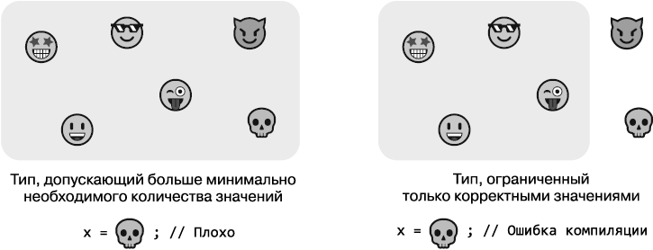 Кроме того, типы ограничивают множество допустимых значений переменных. Шестнадцатибитное целое число со знаком может отражать любое из целочисленных значений от –32768 до 32767 и только их. Благодаря ограничению диапазона допустимых значений исключаются целые классы ошибок, поскольку не допускается возникновения неправильных значений во время выполнения, как показано на рис. 1.2. Чтобы понять многие из приведенных в этой книге концепций, важно рассматривать типы как множества возможных значений.