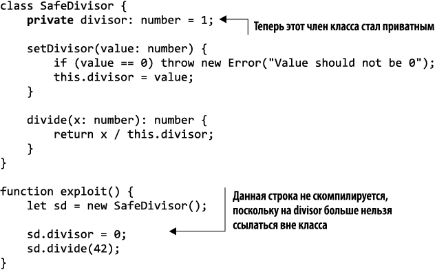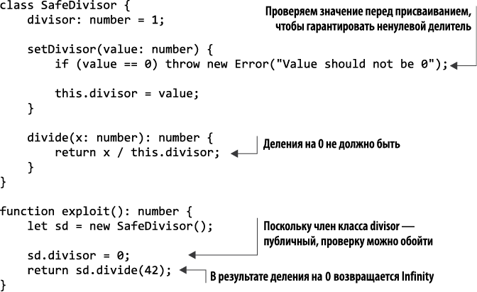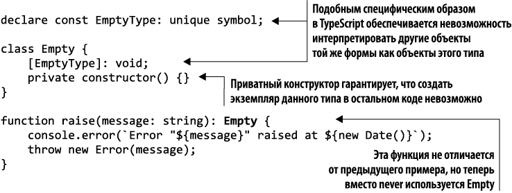 В листинге 2.2 показано, как можно реализовать пустой тип в TypeScript в виде класса, не допускающего создания экземпляров. Обратите внимание: TypeScript считает два типа со схожей структурой совместимыми, так что нам придется добавить фиктивное свойство типа void, чтобы в прочем коде не могло оказаться значения, которое неявно бы преобразовалось в Empty. В прочих языках, например Java и C#, такого дополнительного свойства не требуется, поскольку в них совместимость типов не определяется на основе их формы. Мы обсудим этот вопрос подробнее в главе 7.