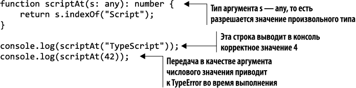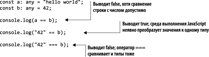 JavaScript — слабо типизированный язык. Чтобы это увидеть, достаточно воспользоваться типом any в TypeScript и делегировать типизацию во время выполнения JavaScript. В JavaScript есть два оператора проверки на равенство: ==, проверяющий равенство двух значений, и ===, проверяющий равенство как значений, так и их типов (листинг 1.15). Поскольку JavaScript — слабо типизированный язык, выражение вида "42"==42 равно true. Это довольно странно, ведь "42" — текстовое значение, а 42 — число.