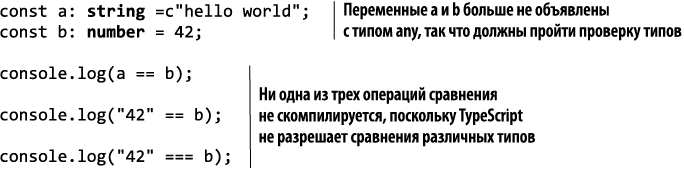 Неявные преобразования типов удобны тем, что не нужно писать много лишнего кода для явного преобразования из одного типа в другой, но и опасны, поскольку во многих случаях такие трансформации нежелательны и неожиданны для программиста. Благодаря сильной типизации TypeScript не скомпилирует ни одну из предыдущих операций сравнения, если объявить должным образом переменную a с типом string и переменную b с типом number, как показано в листинге 1.16.
