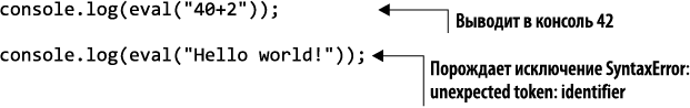Пример подобной нестрогой интерпретации — функция eval() языка JavaScript, выполняющая строковое значение как код. Она отлично работает, если переданная ей строка представляет собой допустимый код на языке JavaScript, но вызывает ошибку времени выполнения в противном случае, как показано в листинге 1.1.