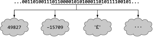 Необходимо не только различать код и данные, но и интерпретировать элементы данных. Состоящая из 16 бит последовательность 1100001010100011 может соответствовать беззнаковому 16-битному целому числу 49827, 16-битному целому числу со знаком –15709, символу '£' в кодировке UTF-8 или чему-то совершенно другому, как можно видеть на рис. 1.1. Аппаратное обеспечение, на котором работают наши программы, хранит все в виде последовательностей битов, так что необходим дополнительный слой для осмысления этих данных.