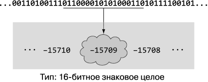 Рис. 1.2. Последовательность битов с типом 16-битного знакового целого. Информация о типе (16-битное знаковое целое число) указывает компилятору и/или среде выполнения, что эта битная последовательность представляет собой целочисленное значение в диапазоне от –32 768 до 32 767, благодаря чему она правильно интерпретируется как –15 709