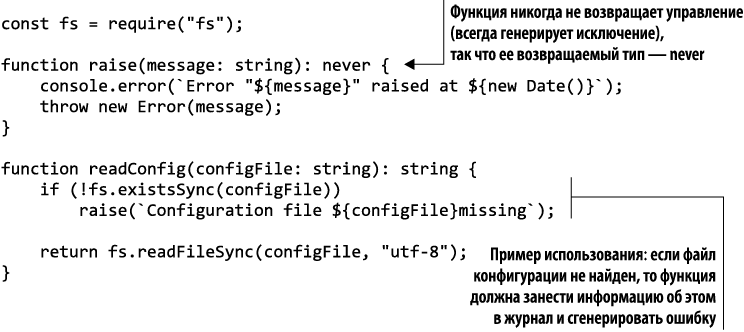 Рассмотрим в качестве примера функцию console.log(): она выводит свой аргумент в отладочную консоль, но не возвращает никаких осмысленных значений. С другой стороны, по завершении выполнения она возвращает управление вызывающей стороне, так что ее возвращаемым типом не может служить never.