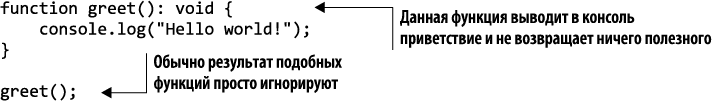 Классическая функция "Helloworld!", приведенная в листинге 2.3, — еще один хороший пример этого. Ее вызывают для вывода в консоль приветствия (то есть ради побочного эффекта), а не в целях возврата значения, так что мы укажем для нее возвращаемый тип void.