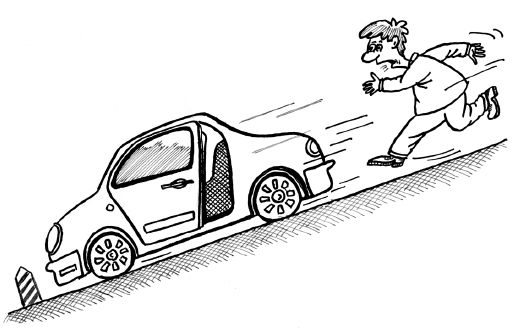 ✓ подложить под колеса с противоположной стороны противооткатные упоры (можно использовать камушки или толстые палки);