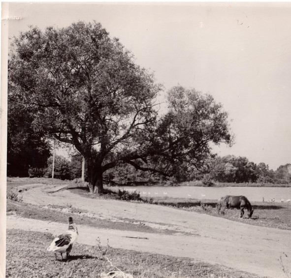 На снимке — «сельская идиллия» из недалёкого прошлого (1986 год). Перед нами тот самый пруд, который возник после сооружения плотины из остатков разрушенной немцами церкви. Школа на снимке не видна — она находится за кадром слева. У пруда спокойно пасутся гуси и даже лошади. Сам пруд пользовался большим «уважением» у молодых мужиков, возжелавших закусить самогон свежими жареными карасями и ротанами, коих водилось здесь предостаточно. Чем не идиллия? Теперь уже нет и пруда и, естественно, рыбы, исчезли и гуси. А лошадьми в селе теперь заниматься некому, да и «лошадиных работ» стало мало — техника неуклонно вытесняет их из обихода и производственного процесса.