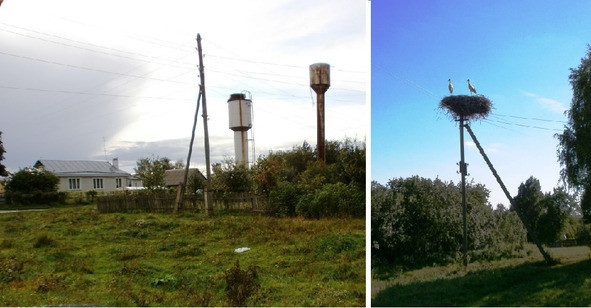 Гнёзда аистов: на левой водонапорной башне и на столбе ЛЭП