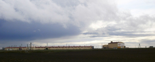 Вид с дороги на свиноводческий комплекс. Другие корпуса находятся далее, за первым приземистым зданием, там же расположены и отстойники