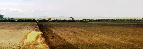 Ближе к осени аисты, по-видимому, со всей округи, собираются в большие стаи и, готовясь к отлёту, кормятся на распахиваемом поле, здесь же, за Согласием, напротив свиноводческого комплекса, куда мы и подъехали.