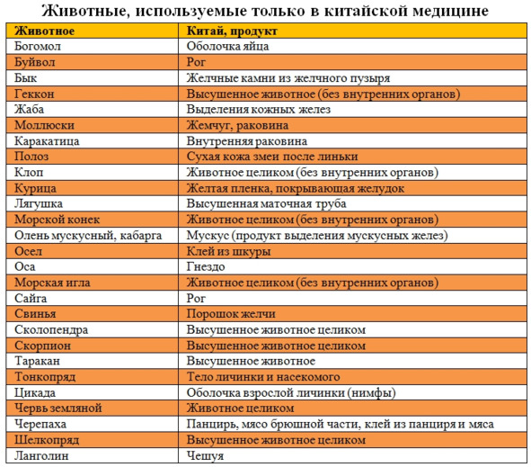 В китайской традиционной медицине список применяемых продуктов, получаемых от животных, огромен. Даже количество официально применяемого животного сырья в китайской медицине заметно больше, чем в российской.