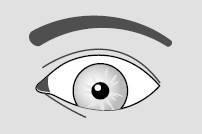 Радужка слегка прикрыта верхним веком и касается нижним краем нижнего века. Белочная оболочка видна по бокам от радужки.