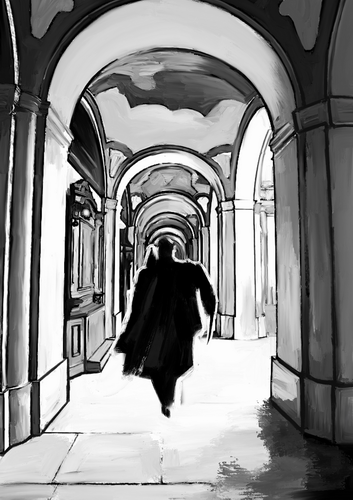 "Be it so," I said, replacing the tool beneath the cloak and again offering him my arm. He leaned upon it heavily. We continued our route in search of the Amontillado. We passed through a range of low arches, descended, passed on, and descending again, arrived at a deep crypt, in which the foulness of the air caused our flambeaux rather to glow than flame.