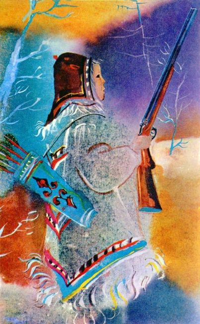Вот с дерева, куда смотрела палка, свалилась рысь. Богатырь следил за новым человеком. Он видел, как тот надел палку на спину (к палке веревка была привязана). Подошел к убитому зверю. У человека лицо густо заросло волосами. Похожи волосы его на прошлогоднюю траву на болоте. А сам — большой, высокий, широкий. Человек ободрал рысь. Взял шкуру. Пошел. Эвенк за ним. Но наступил на сухой сук. Человек оглянулся. Эвенк остановился. Человек подошел к богатырю. Спросил: