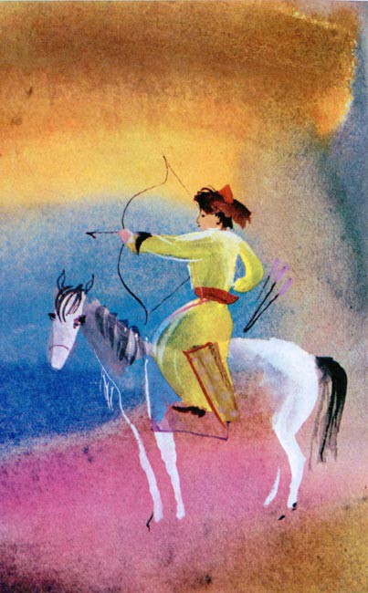 Но вот родился среди людей один человек. Рос он не по дням, а по часам. Вскоре он вырос богатырем и никакой силы не боялся. Пошел к нему народ просить, чтобы он всех от беды избавил и ту огненную птицу убил. Послушался богатырь. Из ста деревьев себе лук сделал, из двухсот лесин стрелу вытесал и отправился на охоту. Вскоре вся земля содрогнулась.
