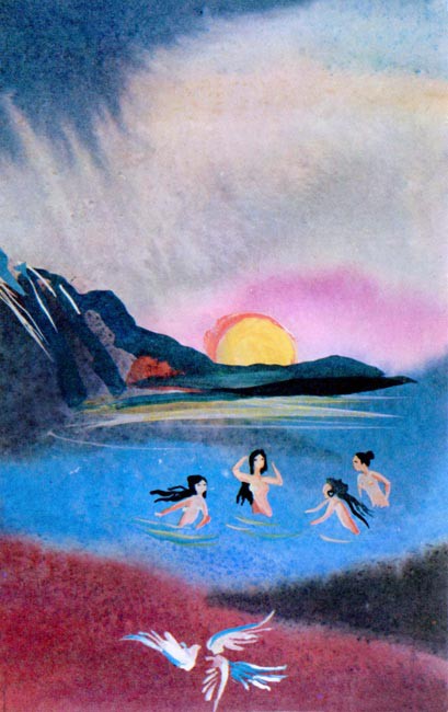 Рассердился Хоридой, поломал стрелы у братьев и пошел на юг Байкала. Тут он видит: в воде плескаются лебеди, а одна из них на берегу. Он подкрался к платьям и взял одно себе за пазуху. Вышли лебеди из воды, все оделись, а одна не может. Показался Хоридой из-за кустов, те вспорхнули и полетели, а эта стоит и говорит: