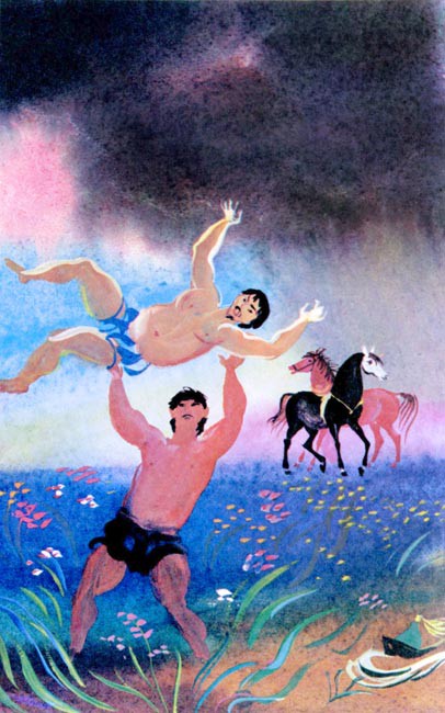 Улунтуй согласился. Они надели кушаки и сошлись. Улунтуй просунул один палец за кушак Харахана, и красный кушак, как гнилая тряпка, разлетелся на куски. Харахан удивился силе Улунтуя, но отступать не хотел. Он сказал своей свите, чтобы они убили двух коней и из их кожи сделали ему хороший, крепкий кушак. Не успел он отдать приказ, как такой кушак был уже на нем. Улунтуй попробовал кушак двумя пальцами, и он порвался на мелкие ленточки.