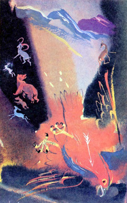 Люди боялись той птицы и убить ее никак не могли, потому что, когда она летала, от нее такие горячие лучи шли, что охотники замертво падали.
