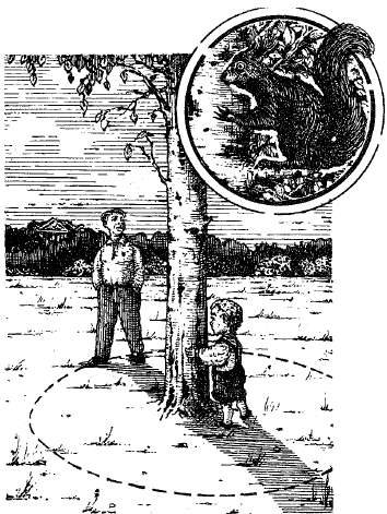 — Сегодня утром я с белкой в прятки играл, — рассказывал во время завтрака один из собравшихся за столом дома отдыха. — Вы знаете в нашем лесу круглую полянку с одинокой березой посередине? За этим деревом и пряталась от меня белка. Выйдя из чащи на полянку, я сразу заметил беличью мордочку с живыми глазками, уставившуюся на меня из-за ствола. Осторожно, не приближаясь, стал я обходить по краю полянки, чтобы взглянуть на зверька. Раза четыре обошел я дерево, но плутовка отступала по стволу в обратную сторону, по-прежнему показывая только мордочку. Так и не удалось мне обойти кругом белки.