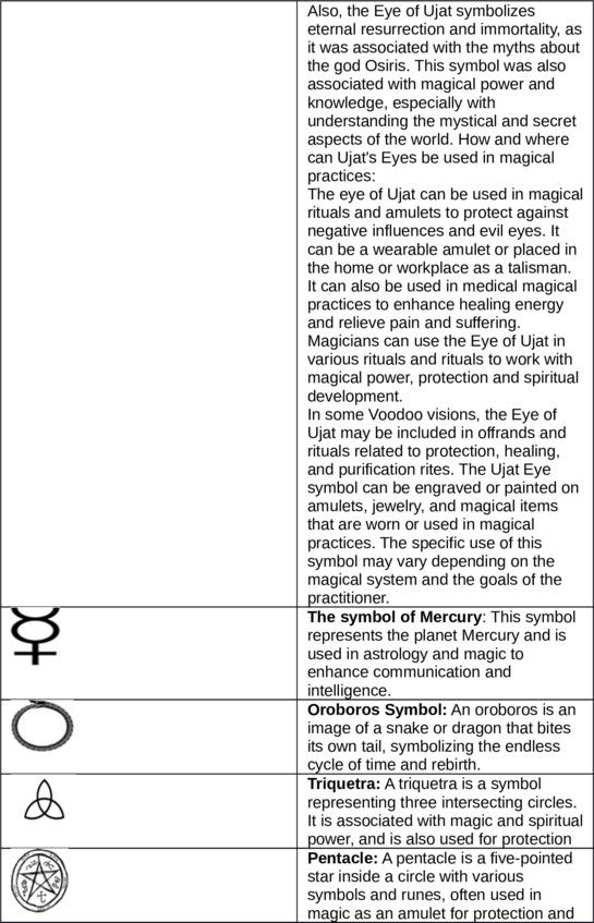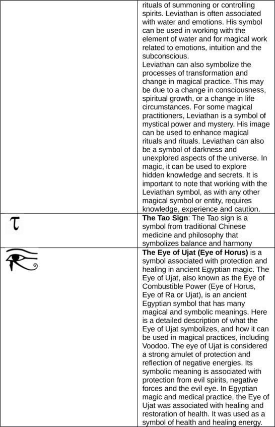All these symbols and signs are just a small part of the rich symbolism of Voodoo Magic. They are used to perform rituals, create amulets and talismans, as well as to appeal to spirits and gods. Each of them has its own unique meaning and context in the religious and magical practice of Voodoo Magic.