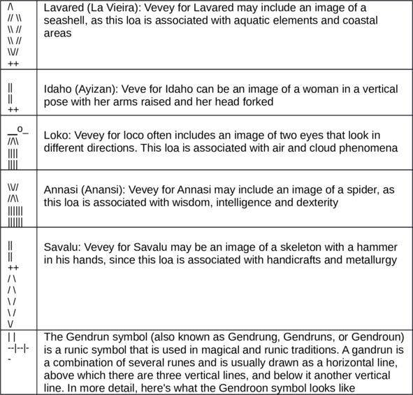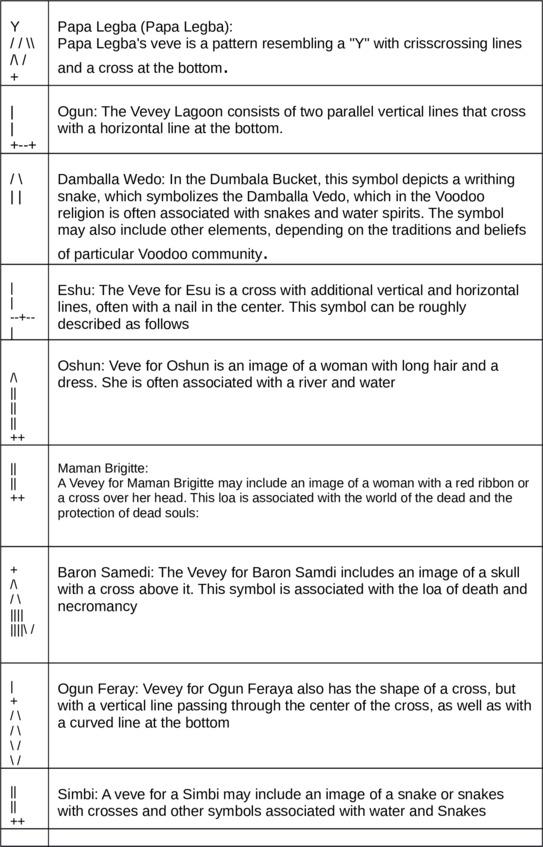 Let’s take a closer look at some of the signs and instruments in more detail. So, Veves are symbolic drawings that are associated with various loa (spirits or gods) in the Voodoo religion. Each Loa has its own unique veve, which is used to invoke and address it during rituals and ceremonies. Below are examples of veves for some of the most famous Loa (gods) in Voodoo and their brief description:
