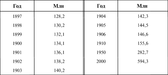 Данные первой русской переписи относятся к 28 января 1897 г., т. е. они уже теперь устарели на 9 лет и отчасти уже требуют в применении к современности своего рода поправок или дополнений. Такие поправки особенно необходимы в общем количестве жителей, но во многих других числах изменения мало влияли на отношения, которые необходимо знать, потому что за истекшие 9 лет еще не успело произойти существенных перемен, в ожидании которых и надо разбираться в существующем численном материале. Прибыль с 1897 г. населения в отдельных губерниях и областях, конечно, не вполне одинакова, но определить существующую здесь степень различия нет никакой возможности с какой-либо степенью точности, и разность эта великой быть не может. Для всей же России, взятой как целое, на основании данных, собираемых Центральным статистическим комитетом Министерства внутренних дел[4] о числе рождающихся и умирающих, должно принять прирост никак не менее 15 чел. в год на 1000 жителей. Это допущение дает следующее вероятное количество всего населения России по годам: