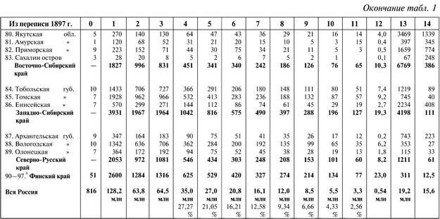 В табл. 1 даются первейшие сведения о составе населения частей империи и о величине поверхности этих частей, чтобы выяснить густоту населенности. Но предварительно (начальный столбец без нумерации) приводится число уездов каждой губернии или области, потому что в переписи единицами для счетов служили уезды, следовательно, все сведения можно было бы дать по уездам, чего не сделано мною по той причине, что всех уездов 816, а при такой многочисленности теряются обозрительность и сравнимость данных. Для местной статистики и для разработки многих частных вопросов в переписи найдутся все данные по уездам.