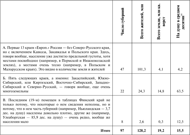 Ввиду того важнейшего значения, которое имеет густота населенности 10 для всего народного быта, даже для всей истории отдельных народов и всего человечества, она принята в большое внимание как при разделении всей империи на отдельные края, так и при расположении краев в таблицах (см. таблицу на с. 50).