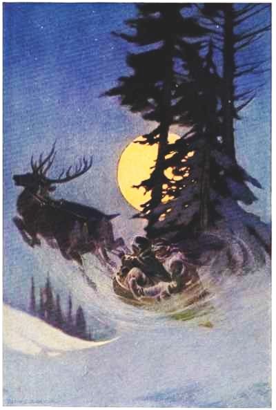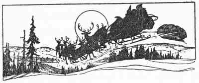 They had hardly started, however, when the sound of sleigh-bells reached them, coming from far over the snow, and before they could tell where it was, who should appear, sailing along over the ice-peaks, but Santa Claus himself, in his own sleigh, all packed with Christmas things, his eight reindeer shining in the moonlight and his bells jingling merrily. Such a shout as he gave when he found that they had actually got the bear and had the robe to show for it! It did them good; and both Tommy and Johnny vied with each other in telling what the other had done. Santa Claus was so pleased that he made them both get in his sleigh to tell him about it. He let Sate get in too, and snuggle down right at their feet. Johnny’s box-sled he hitched on behind. The dogs were turned loose. At first Tommy feared they might get lost, but Santa Claus said they would soon find their way home.