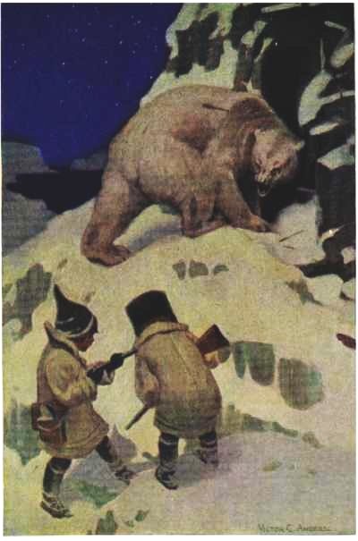So they crept along until they reached the foot of a high ridge of ice piled up below a long ledge of black rock which seemed to rise out of the frozen sea. Up this they worked their way, stooping low, the guide in front, clutching his bow and arrow, Johnny next, clutching his gun, and Tommy behind, clutching his, each treading in the other’s tracks. Suddenly, as he neared the top, the guide dropped flat on the snow. Johnny followed his example and Tommy did the same. They knew that they must be close to the bear and they held their breath; for the guide, having examined his bow and arrows carefully, began to wriggle along on his stomach. Johnny and Tommy wriggled along behind him, clutching their guns. Just at the top of the ledge the guide quietly slipped an arrow out of his quiver and held it in his hand, as he slowly raised his head and peeped over. Johnny and Tommy, guns in hand, crept up beside him to peep also. At that instant, however, before Tommy could see anything, the guide sprang to his feet. “Whiz,” by Tommy’s ear went an arrow at a great white object towering above them at the entrance of what seemed a sort of cave, and two more arrows followed it, whizzing by his ear so quickly that they were all three sticking in deep before Tommy took in that the object was a great white polar bear, with his head turned from them, in the act of going in the cave. As the arrows struck him, he twisted himself and bit savagely at them, breaking off all but one, which was lodged back of his shoulder. As he reared up on his hind legs and tried to get at this arrow, he seemed to Tommy as high as the great wardrobe at home. Tommy, however, had no time to do much thinking, for in twisting around the bear caught sight of them. As he turned toward them, the guide with a yell that sounded like “Look out!” dodged behind, but both Tommy and Johnny threw up their guns and pulled the trigger. What was their horror to find that they both had forgotten to load their guns after showing the guide how they could shoot. The next second, with jaws wide open, the bear made a dash for them. Tommy’s heart leapt into his throat. He glanced around to see if he could run and climb a tree, for he knew that grizzlies could not climb, and he hoped that polar bears could not climb either, while Tommy prided himself on climbing and had often climbed the apple-tree in the pasture at home; but there was not a tree or a shrub in sight, and all he saw was the little guide running for life and disappearing behind an ice-peak.
